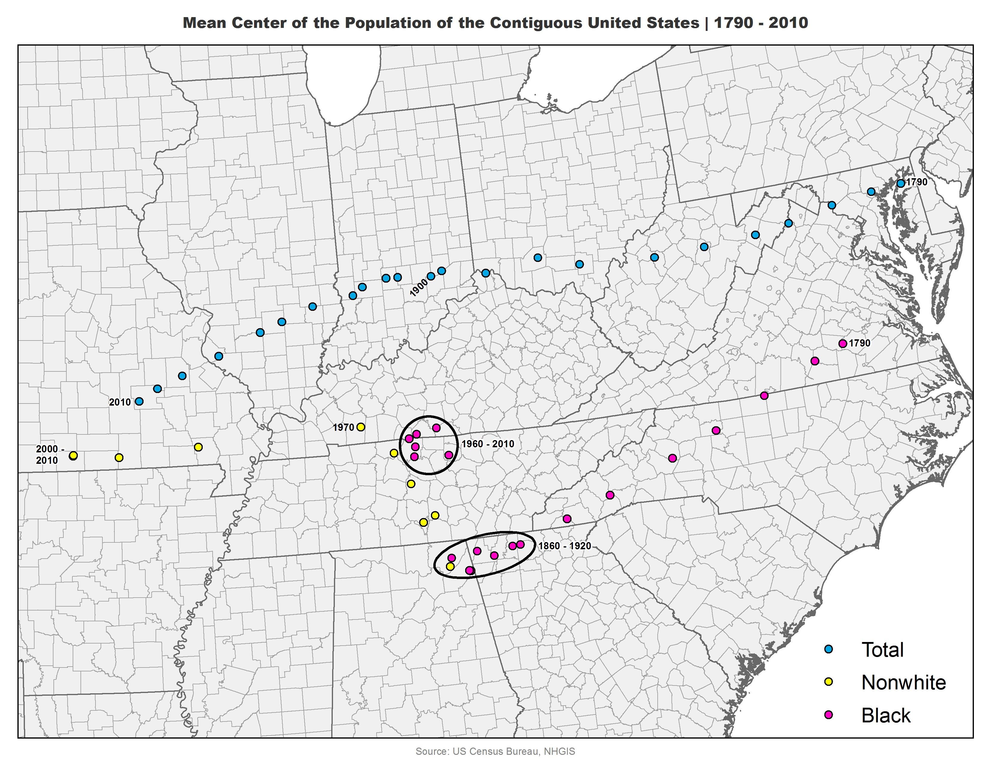 Data visualization : Mean Center of the Population of the Contiguous United States | 1790-2010 (with Nonwhite and Black Populations pulled out) [OC]