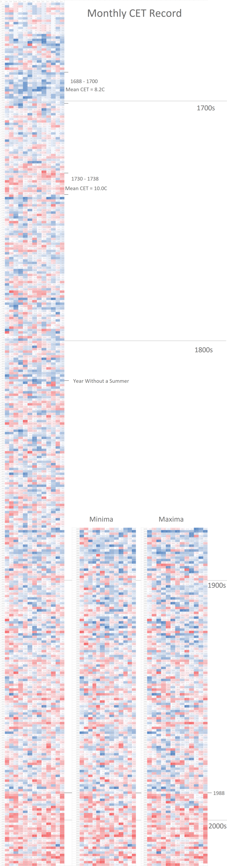 Data visualization : Monthly Central England Temperature (CET) Values, Colour Ranked: January 1659 to November 2018 [OC]