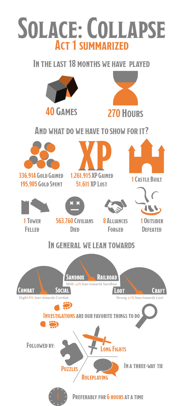 Data visualization : My D&D Campaign summarized in a page of quick stats for my players [OC] (x-posted from /r/dnd)