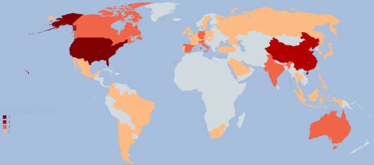 Number of “Alpha cities” in each country according to Globalization and World Cities Research Network 2018 [OC]