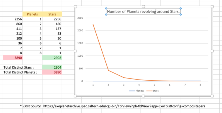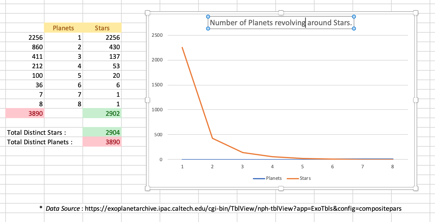 Data visualization : Number of Stars vs Frequency of Planets. [Data Source] – https://exoplanetarchive.ipac.caltech.edu/cgi-bin/TblView/nph-tblView?app=ExoTbls&config=compositepars | Made in Excel – [OC]