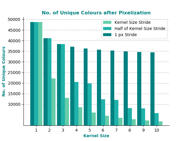 Data visualization : Number of Unique Colours after Pixelization [OC]