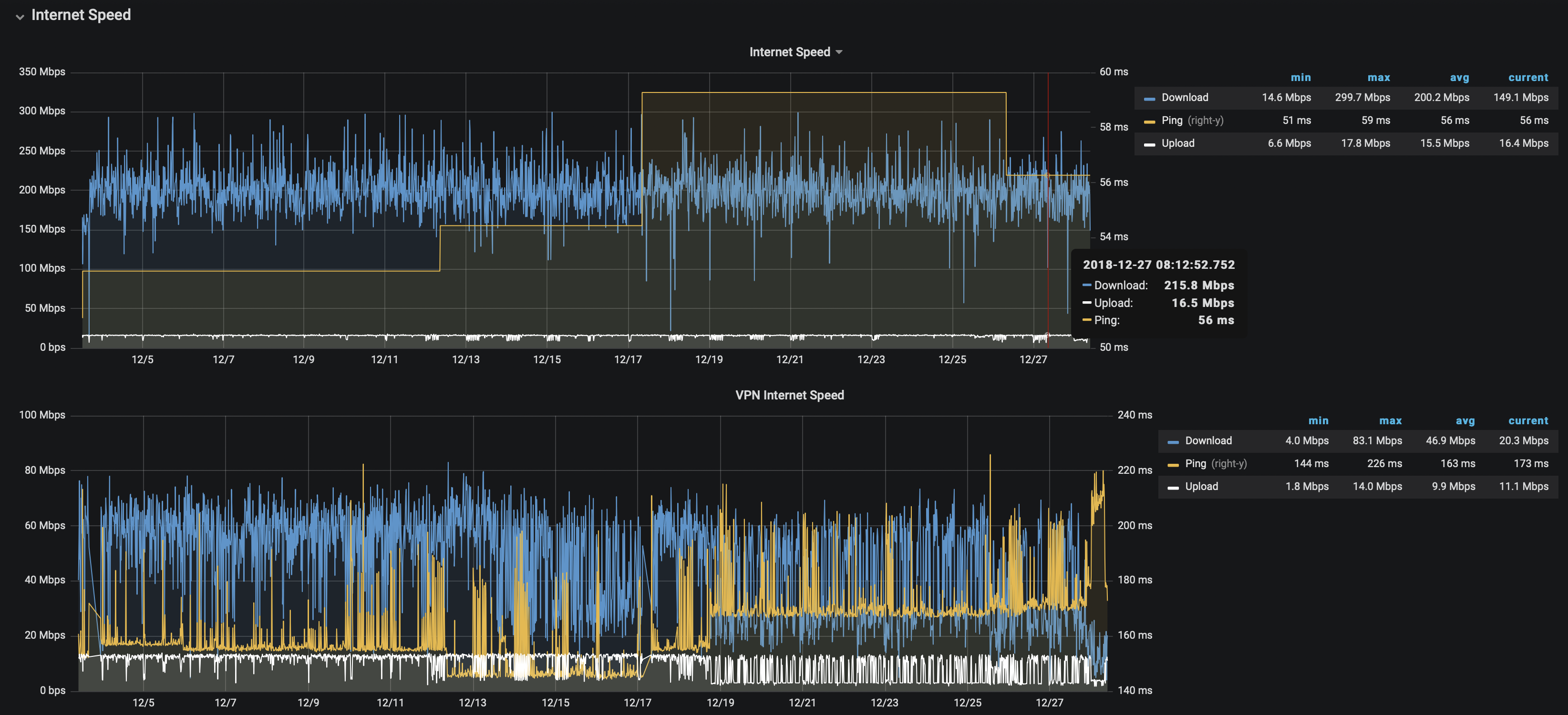 data visualization : [OC] – 30 days of Shaw Internet speed/ping vs PIA VPN(Austria) speed/ping, SK, Canada – measured every minute