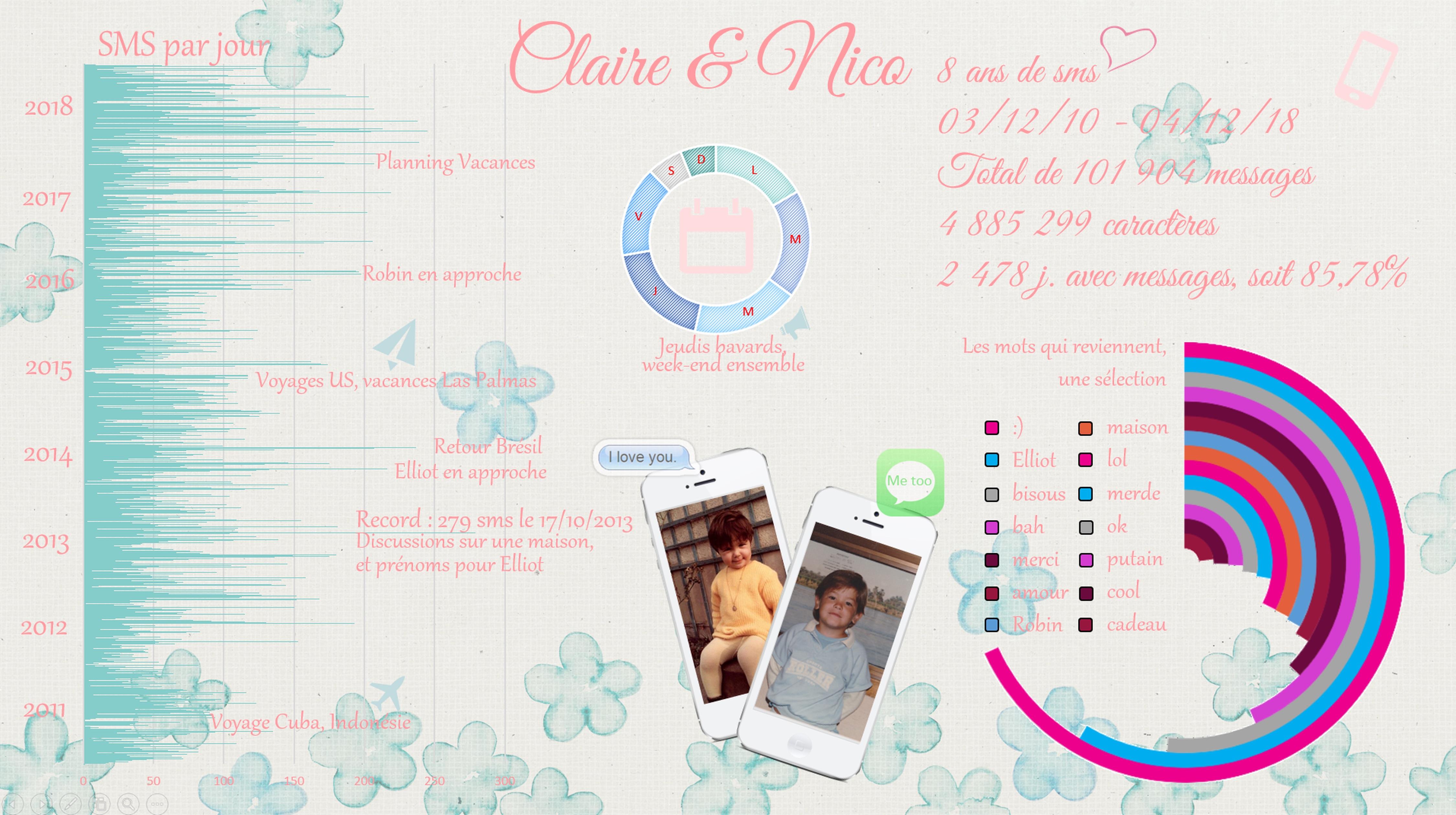 [OC] All text messages exchanged with my fiancée, 8 years and 101,904 messages. (excuse my French 😅)