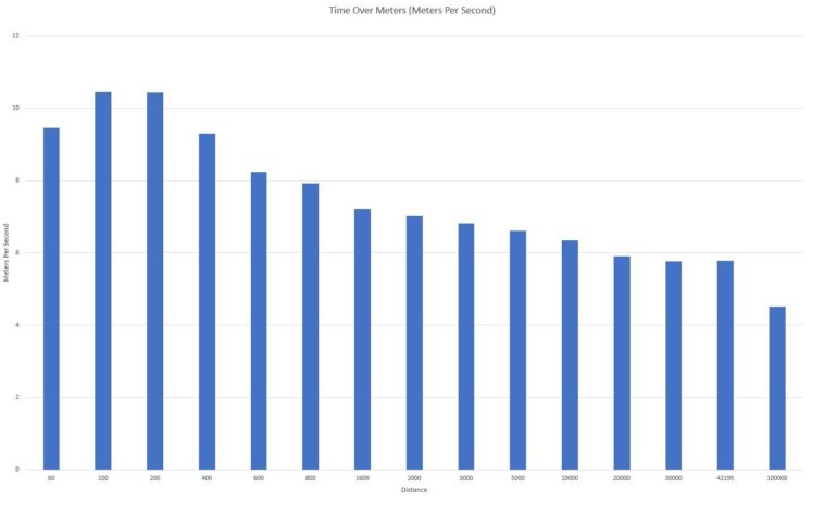 Data visualization : [OC] Average speed (in meters per second) of the world record times of certain track distances.
