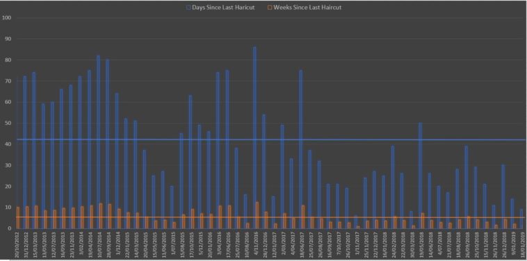 Data visualization : [OC] Every haircut I have had over the past 6 years
