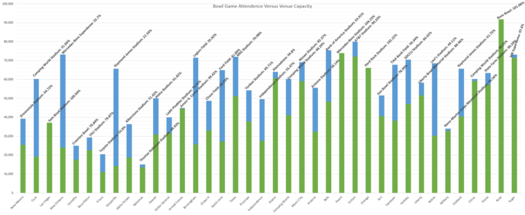 [OC] FBS Bowl Game Attendance vs Venue Capacity