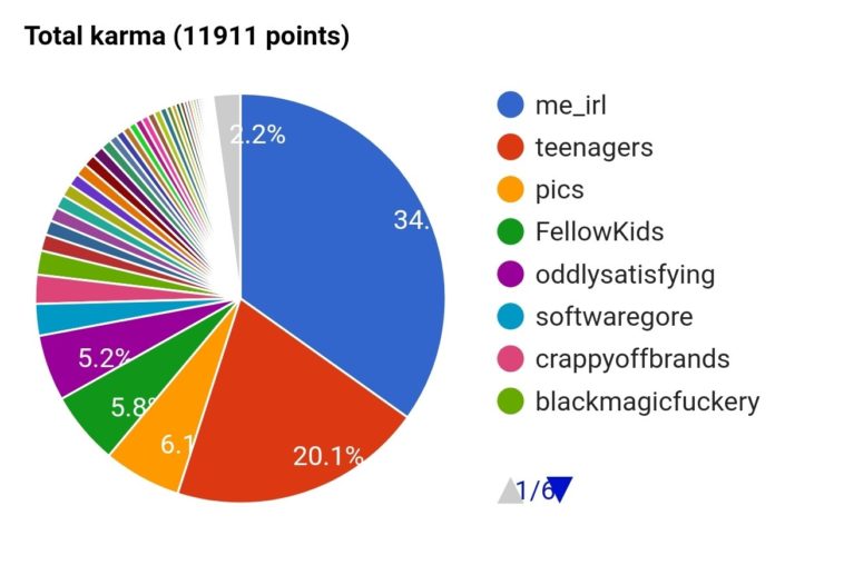Data visualization : [OC] Finally hit 10k karma, heres a break down of where it all came from. (Excludes downvotes)