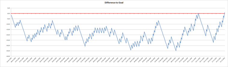 data visualization : [OC] Graph of my running activity 2018 vs. my goal of running a cumulative 600km over the year