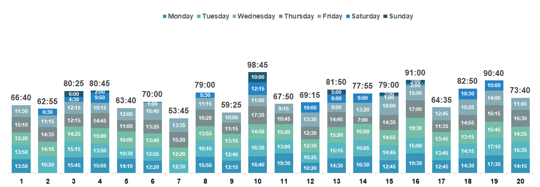 Data visualization : [OC] Hours worked during my first full 20 weeks in Investment Banking