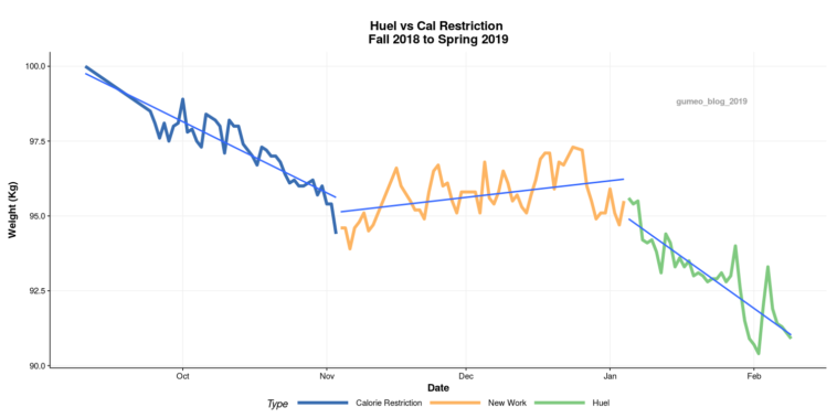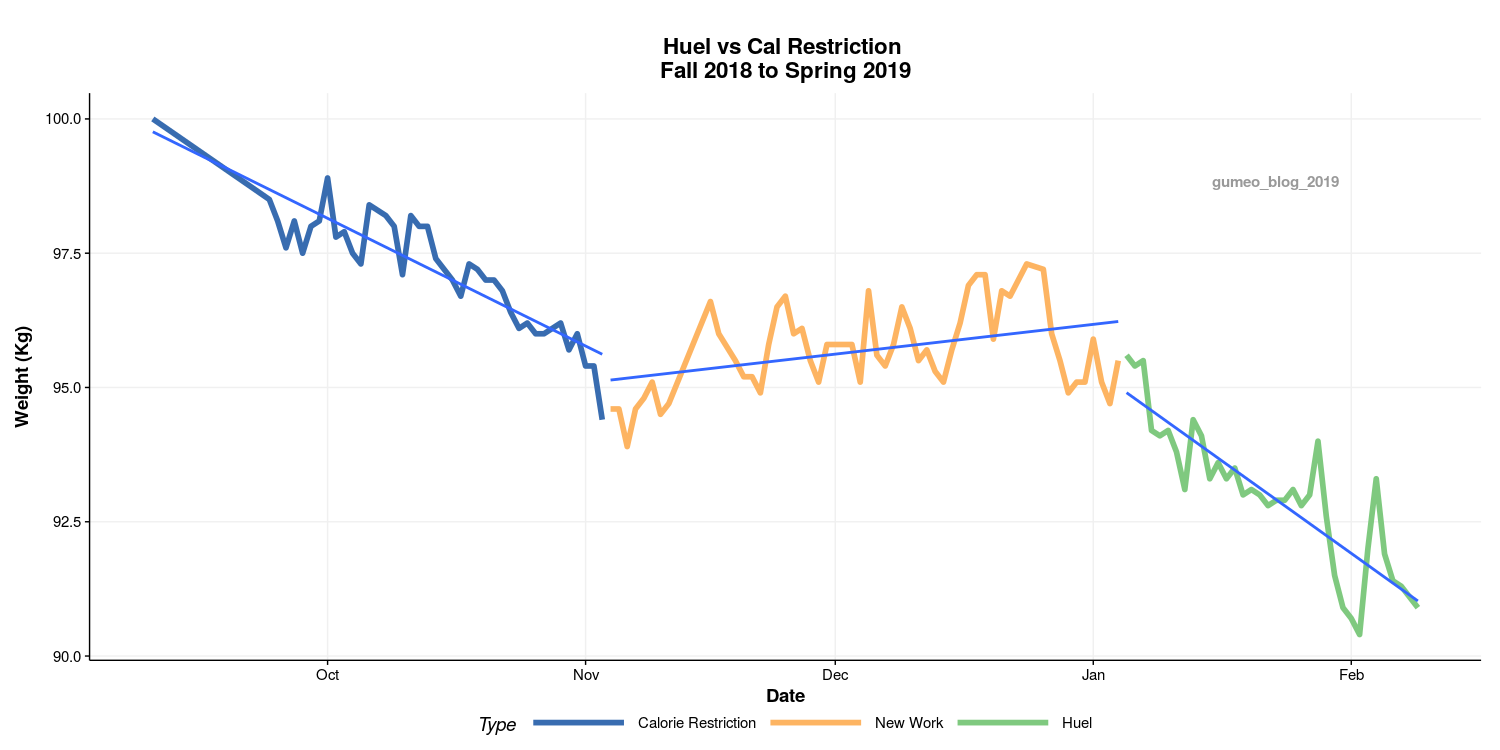 Data visualization : [OC] I logged my weight loss journey and compared calorie restriction with Huel