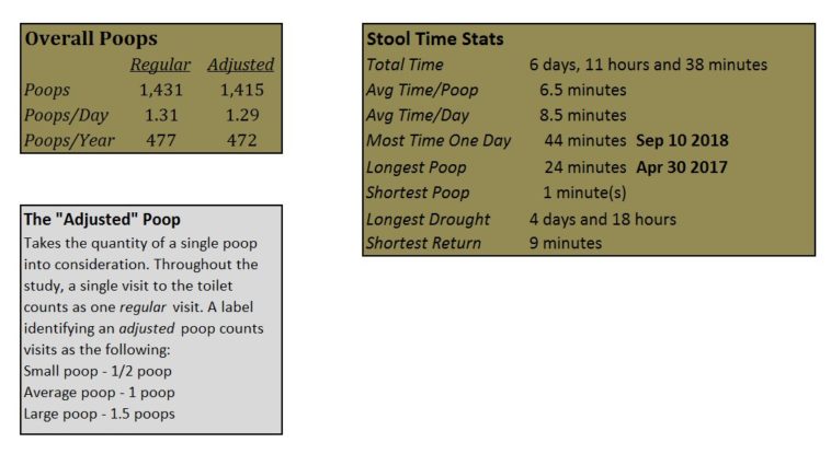 [OC] I pooped 1,431 times in the last 3 years. Here is detailed data on every single one of them.