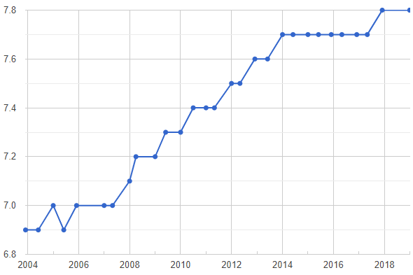 [OC] IMDb rating of TITANIC between 2004-2018 [Source in comments]