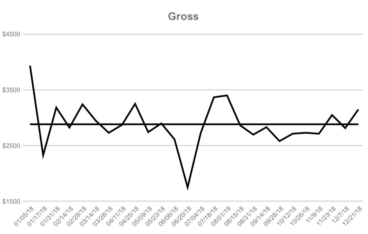 [OC] Looking for help tracking visualizing pay over time. This is one year of fee-for-service work as a physiotherapist.