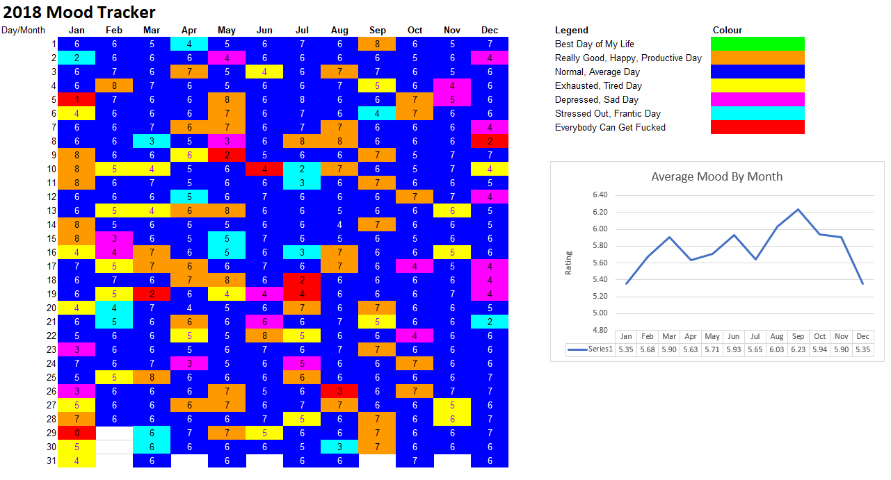 [OC] My 2018 Mood Tracker tracking a rating number and a “feeling” value