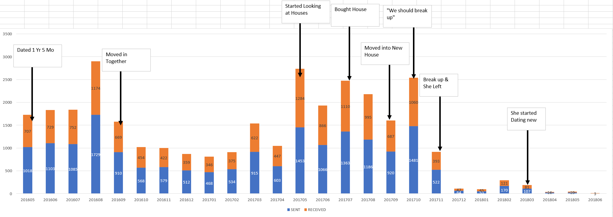 Data visualization : [OC] My first attempt at my Death of a Relationship analysis