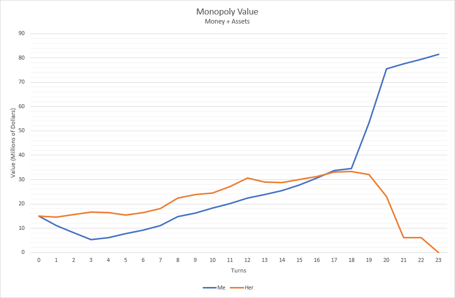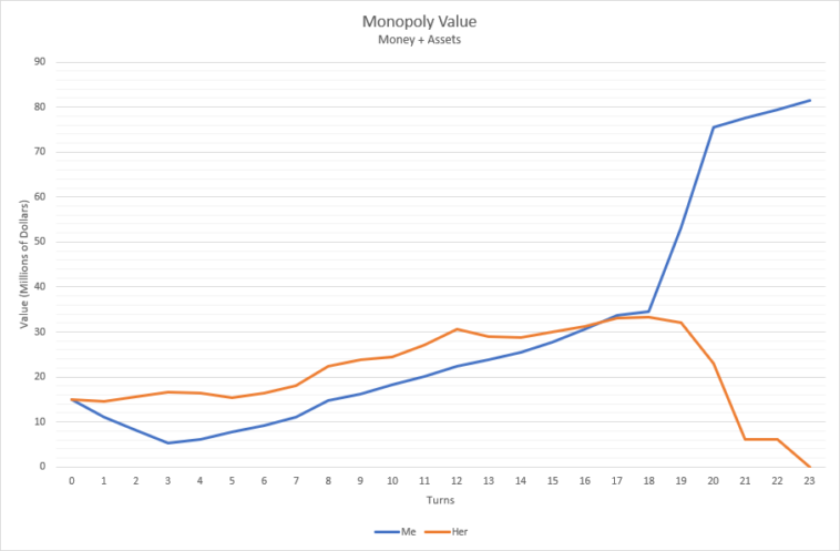 data visualization : [OC] My wife and I’s Monopoly value (money + assets) in a game we played today