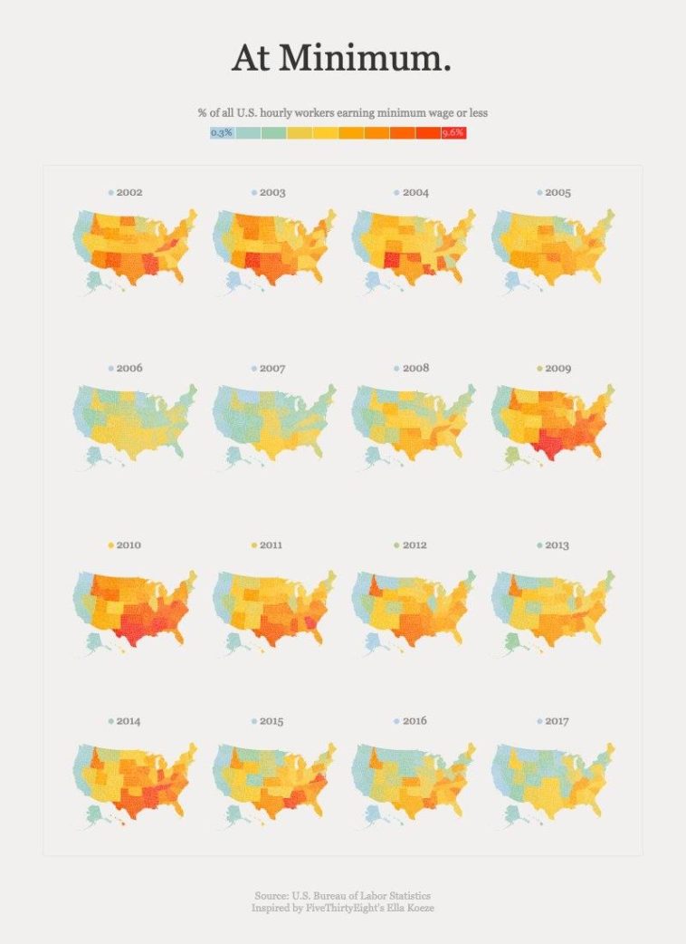 Data visualization : [OC] % of U.S. hourly workers at or below minimum wage since 2001