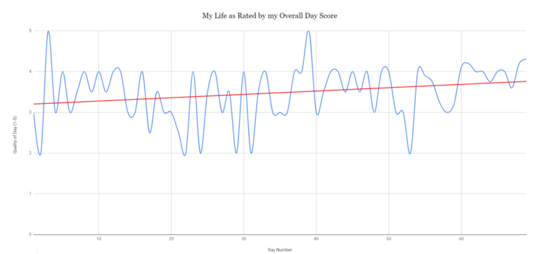 Data visualization : [OC] Over the last 70~ days I recorded the quality of my overall day on a scale of 1-5 and have graphed it below. I am happy to see that the trendline has a positive slope.