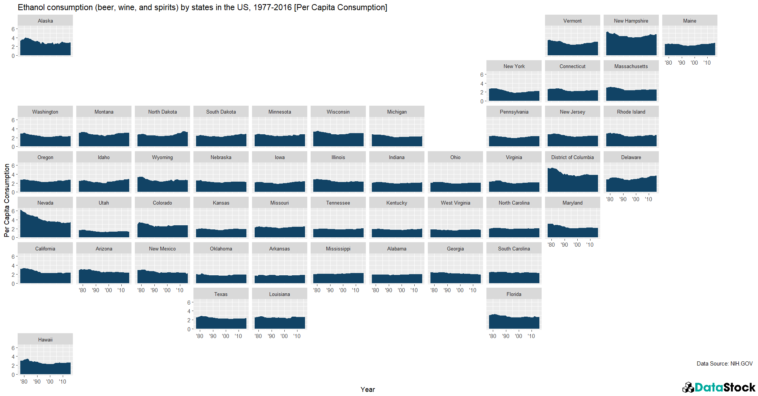 Data visualization : [OC] Per Capita Ethanol Consumption (beer, wine, and spirits) by states in the US, 1977-2016