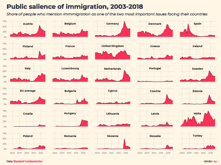 Data visualization : [OC] Public salience of immigration in 29 European countries and the EU, 2003-2018