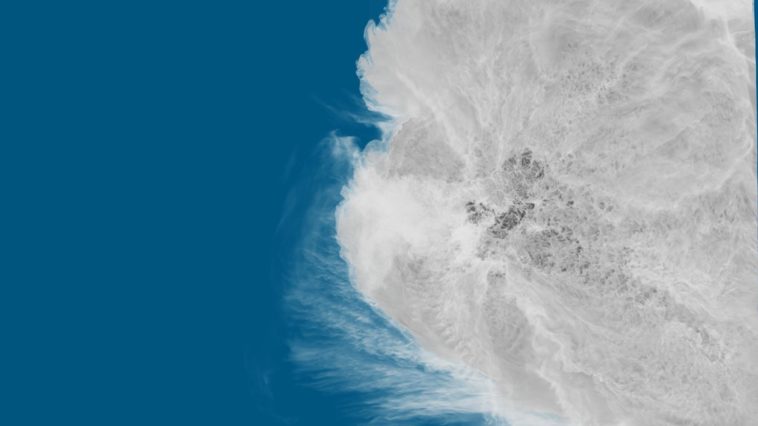 Data visualization : [OC] Simulated Supercell Thunderstorm Anvil (50 meter isotopic resolution) using Paraview – cloud water, ice, and snow volume render.