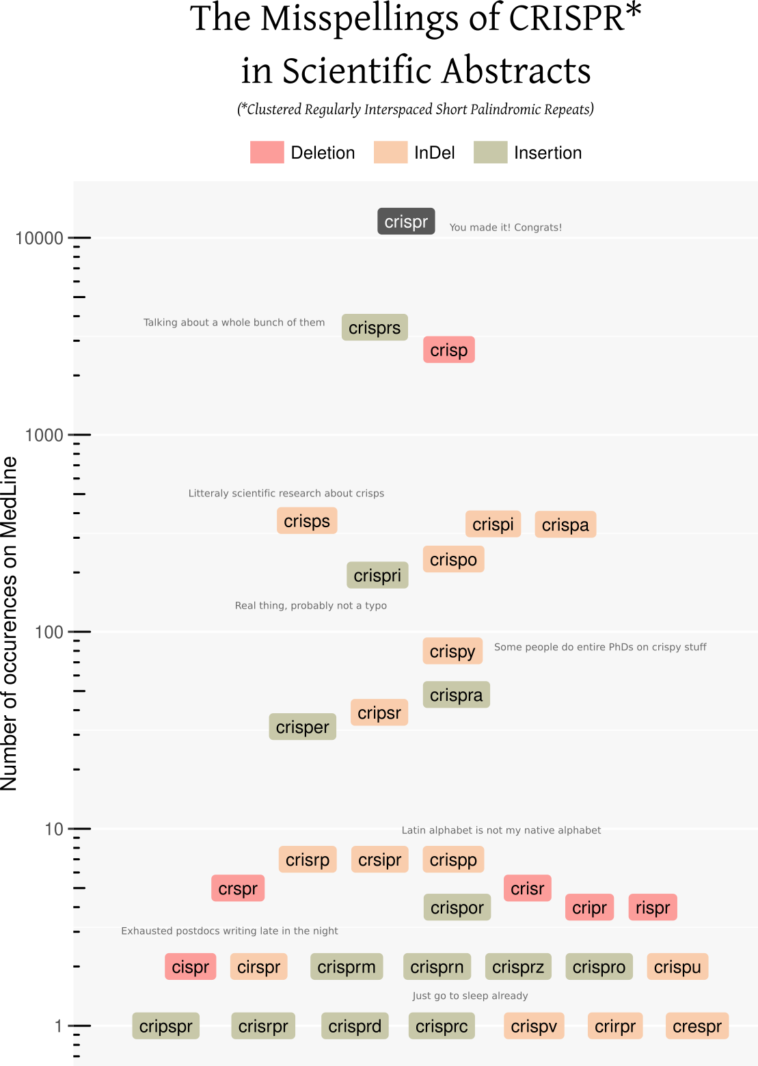 Data visualization : [OC] The most common misspellings of CRISPR in scientific papers
