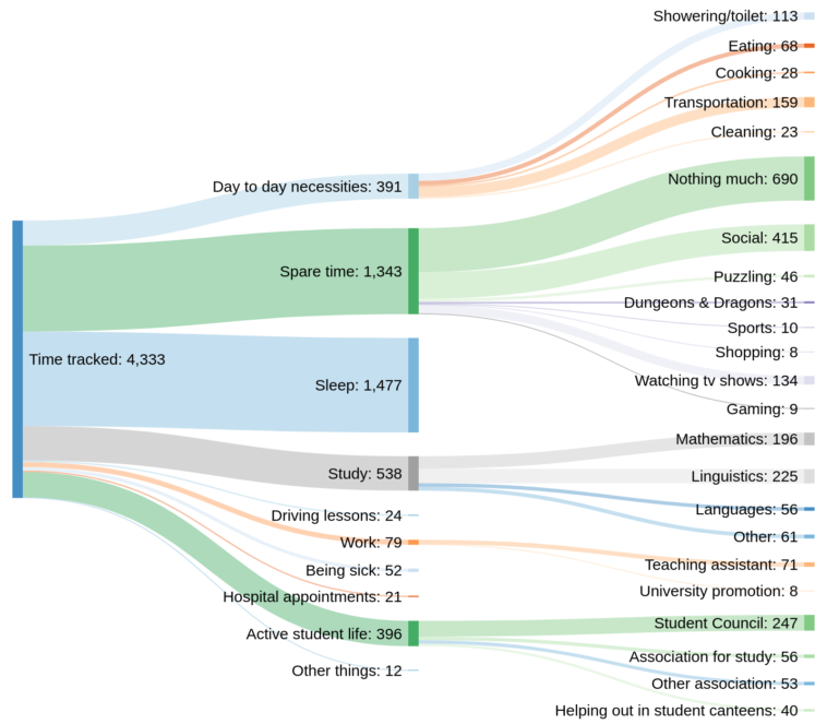 Data visualization : [OC] The past half year of my life in hours spent on activities (explanation of labels in the comments)