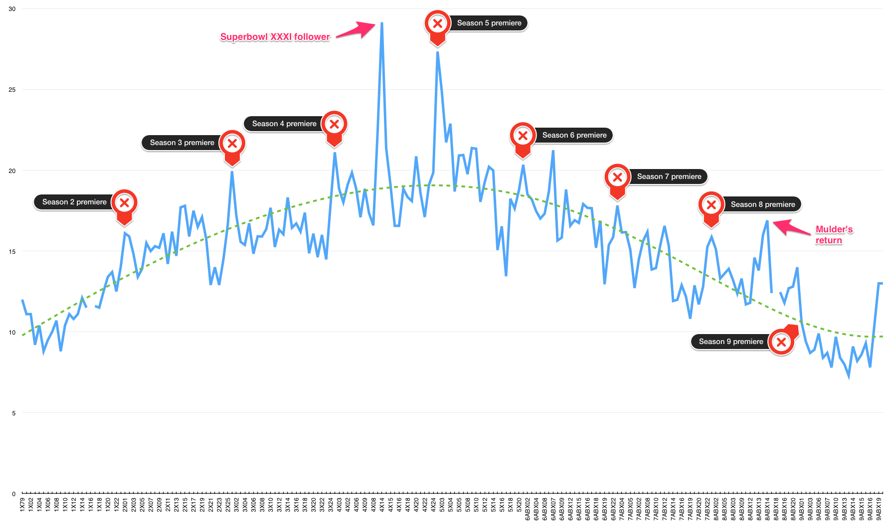 Data visualization : [OC] The X-Files Viewership – Seasons 1-9 (original run)