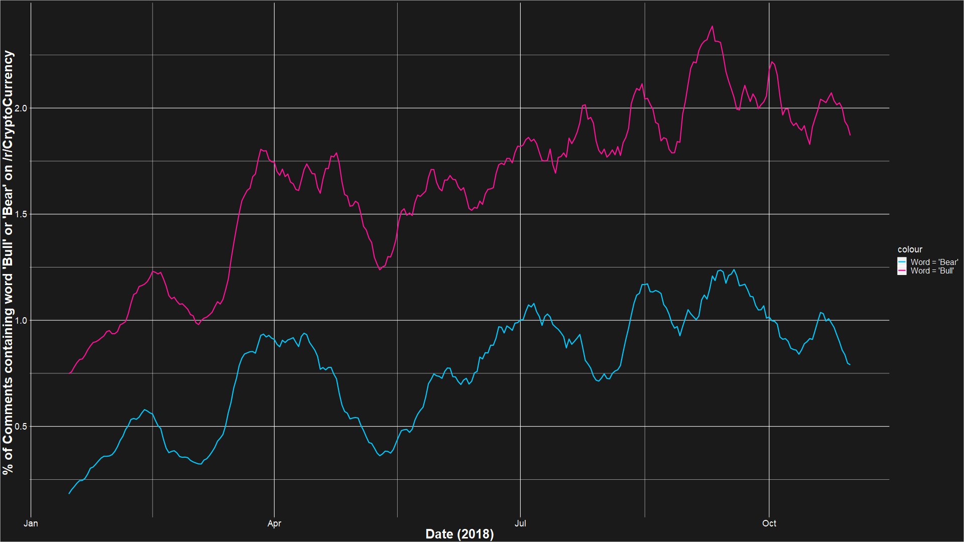 Data visualization : [OC] Trend for usage of words ‘Bear’ & ‘Bull’ in /r/CryptoCurrency Comments for 2018
