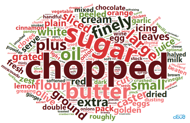 Data visualization : [OC] #WordCloud of text extracted from ingredients of 1600 #Christmas #recipes. That’s right, #sugar, #oil, and #butter have taken the top 3 spots.