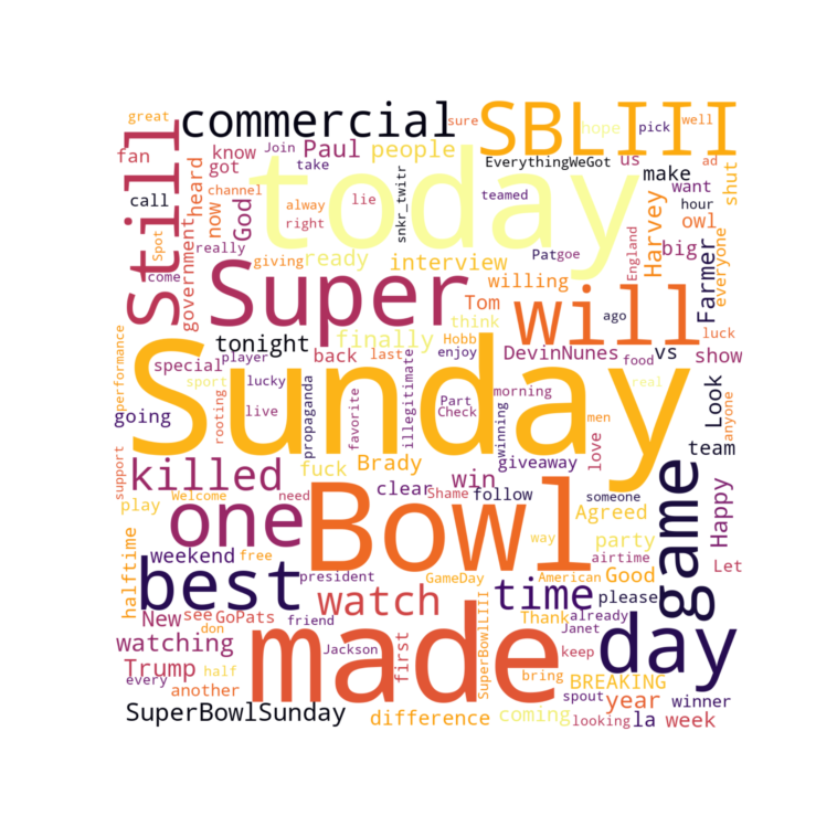 Data visualization : [OC] Worldcloud based on a “superbowl” filter of tweets on 3rd Feb 2019.
