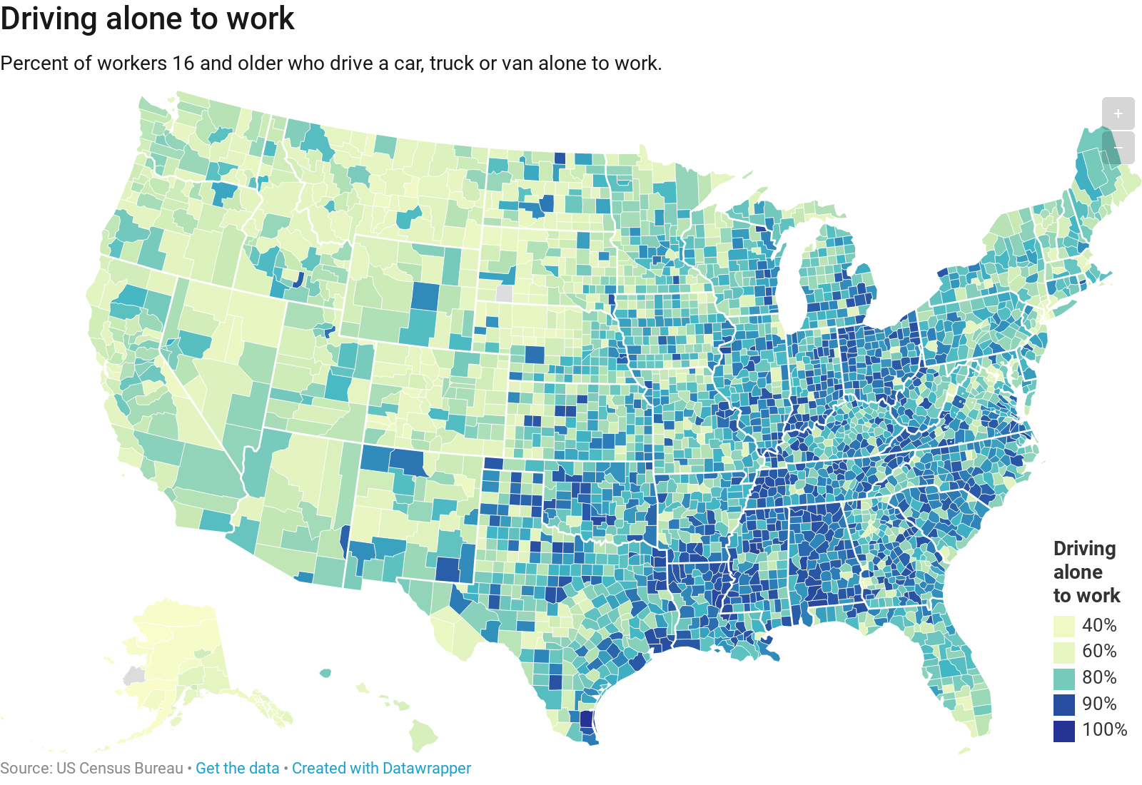 Data visualization : Percent of U.S. workers driving alone to work, by county [OC]