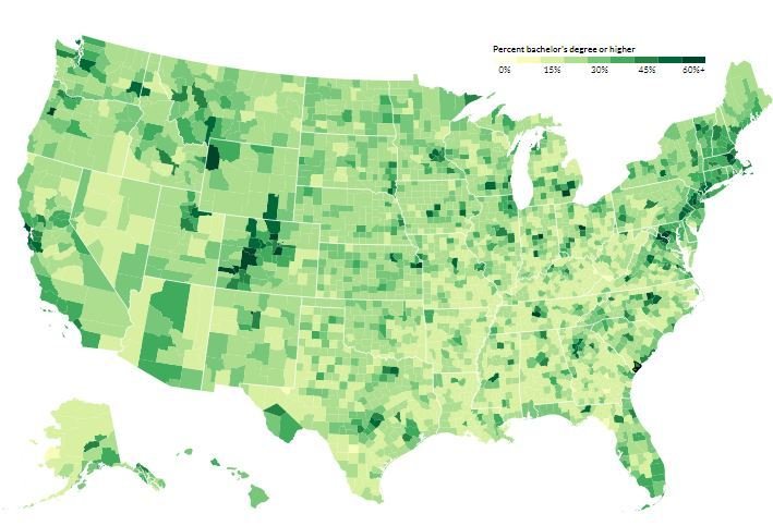 Percentage of individuals 25 or older who have a bachelor’s degree or higher in every U.S. county