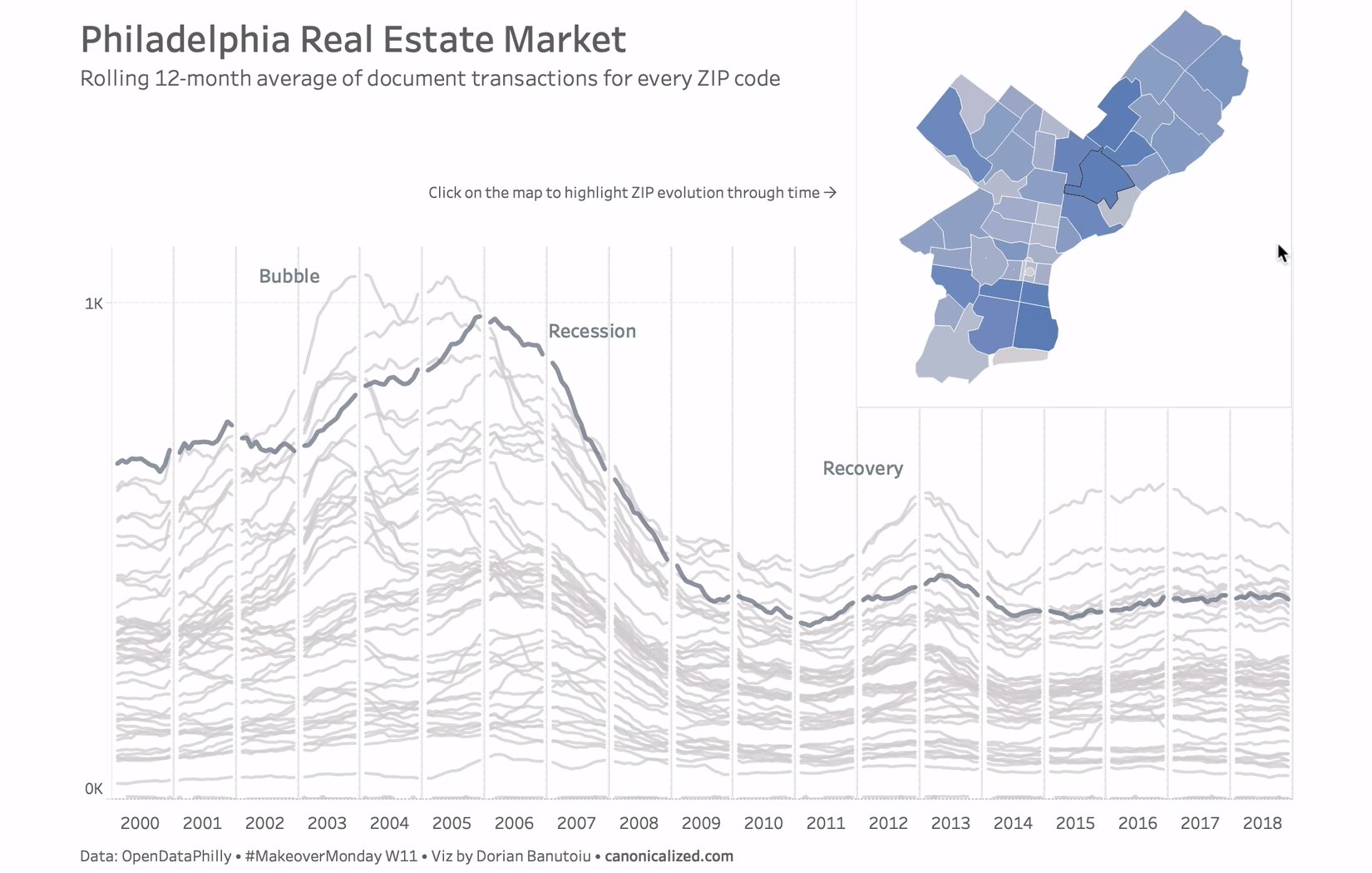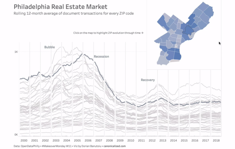 Data visualization : Philadelphia Real Estate Market by number of document transactions ZIP by ZIP (12-month rolling average) [OC]