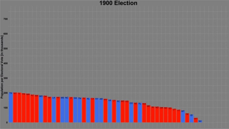 Population per Electoral Vote and Party by State 1900-2016 elections [OC]
