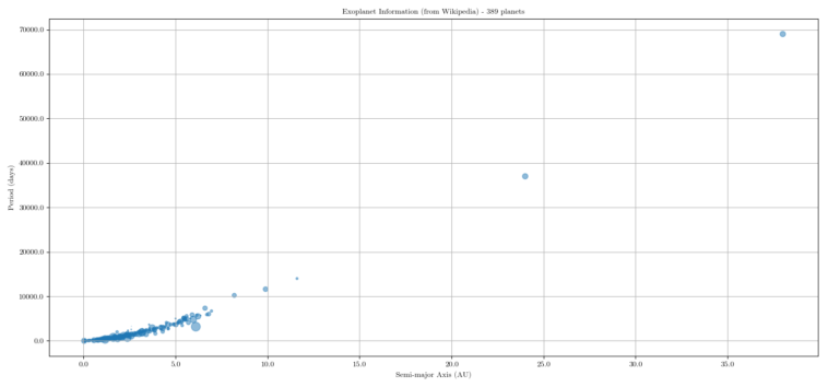 Scatter graph of Exoplanetary data of the exoplanets with the smallest 389 periods. [OC]