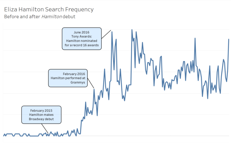 Search frequency for Alexander Hamilton’s wife, Eliza, before and after show debuted on Broadway [OC]