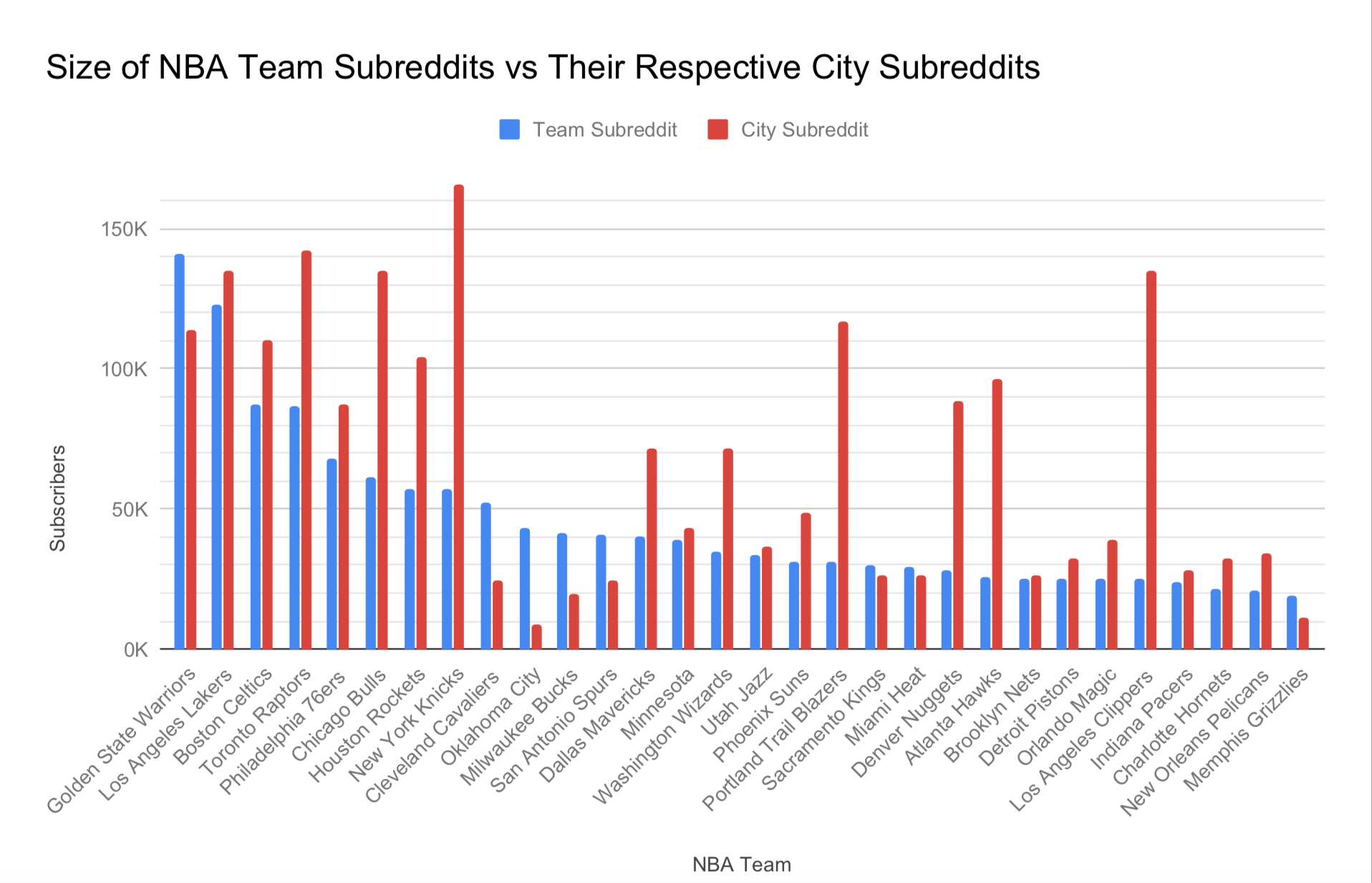 Size of NBA team subreddits vs their respective city subreddits [OC]