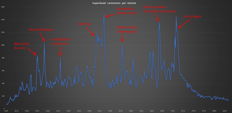 Data visualization : Superbowl comments on Reddit match threads [OC]