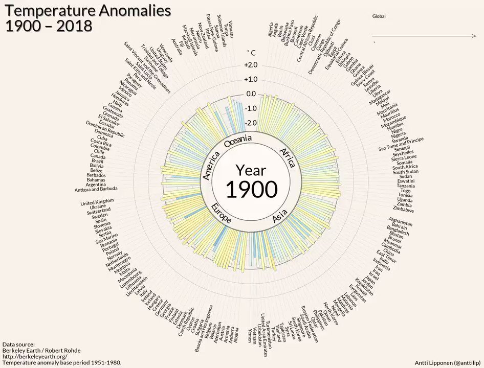 data visualization : Temperature anomalies arranged by country 1900 – 2018