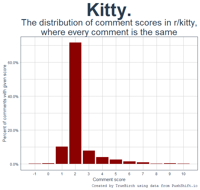 Data visualization : The distribution of comment scores in a sub where every comment is the word “Kitty.” [OC]