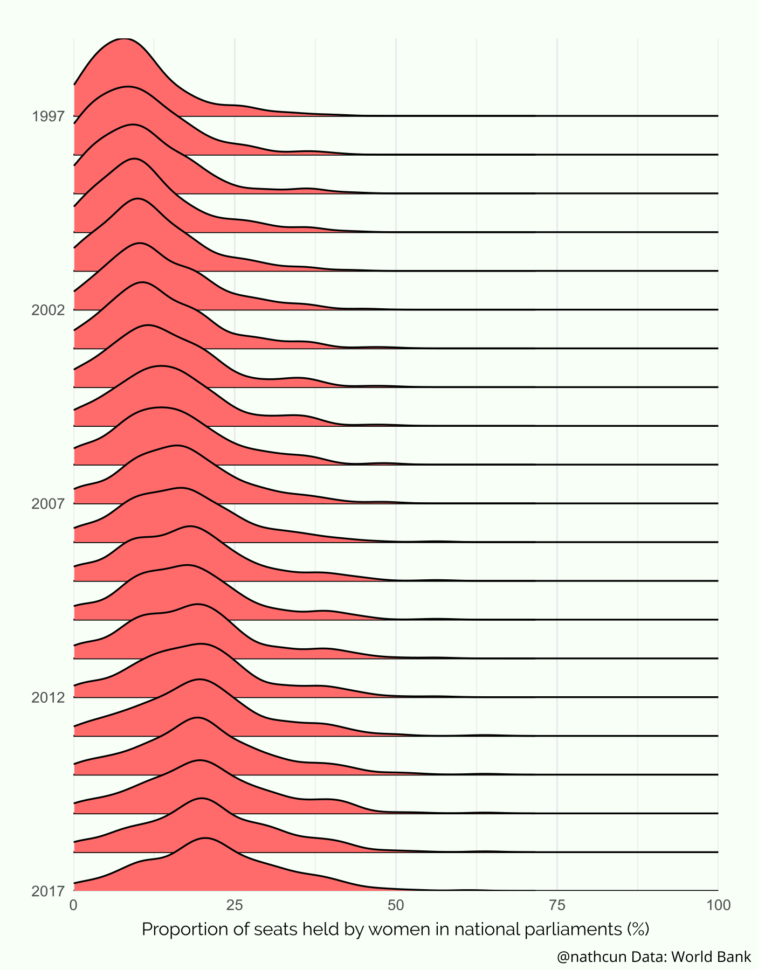 data visualization : The % of seats held by women in national parliaments worldwide has been steadily creeping up over the past 20 years. [OC]