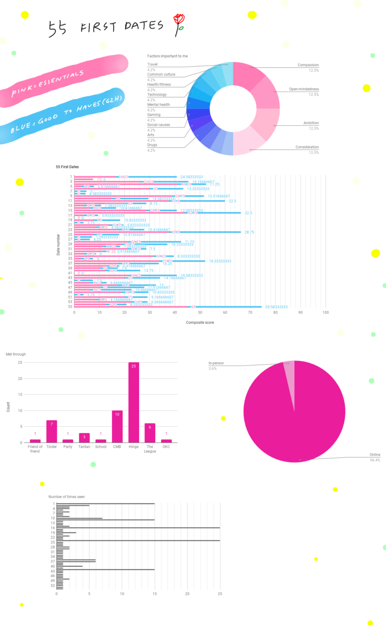 Data visualization : Tired of failed relationships, I kept track of and analyzed my dates with 55 different people in detail from 4/2018-10/2018 to try and “figure it out” once and for all [OC]