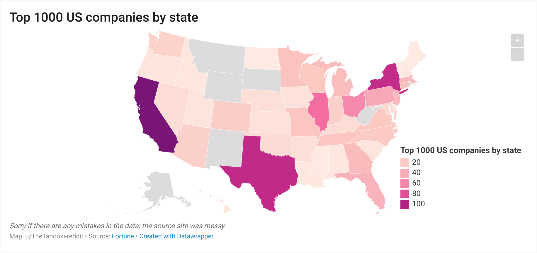 Data visualization : Top 1000 US companies by the state their headquarters are in [OC]
