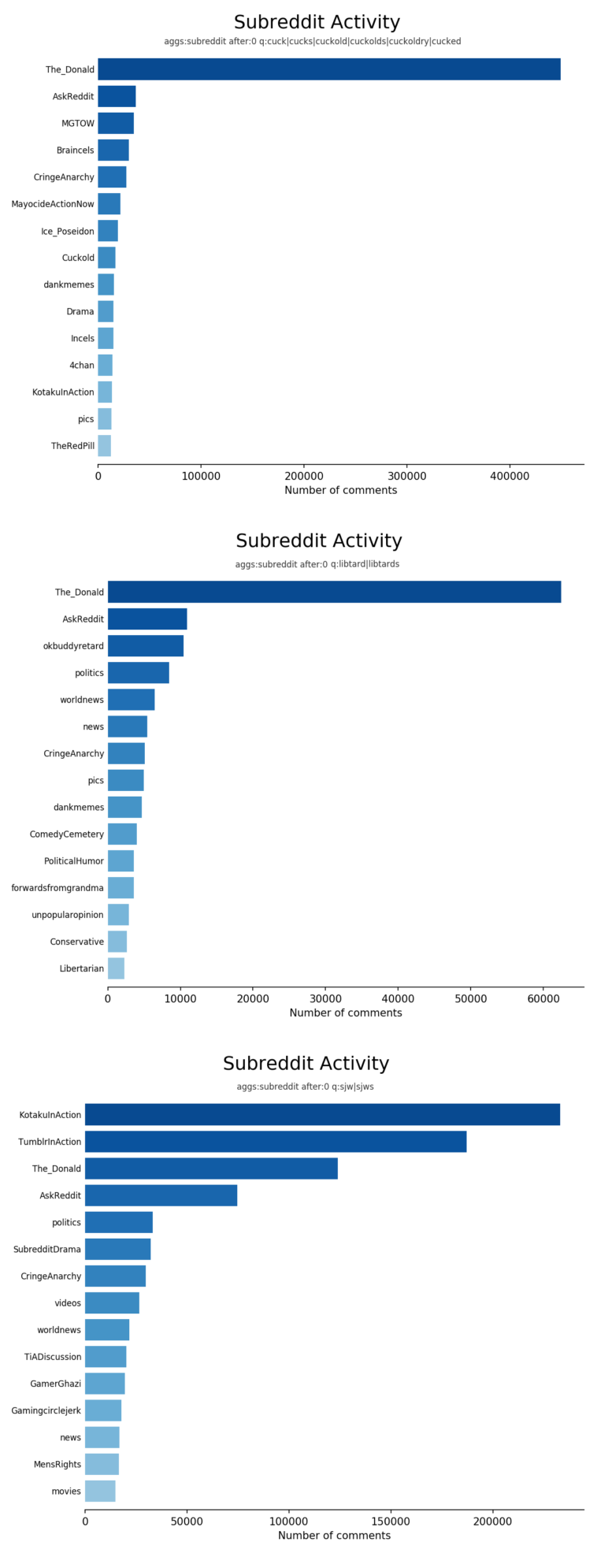 Data visualization : Top 15 Subreddits for Use of Variations on the Words “Cucks”, “Libtards”, and “Sjws” [OC]