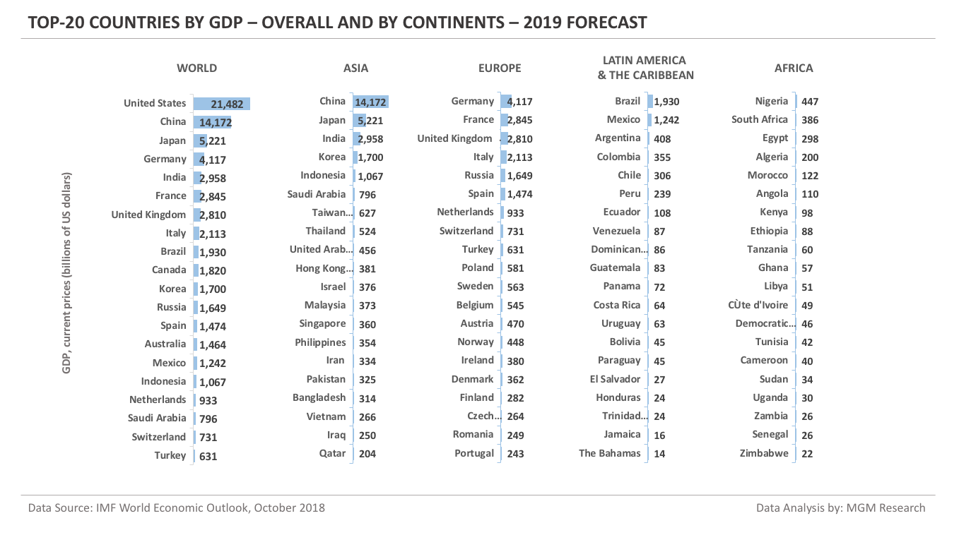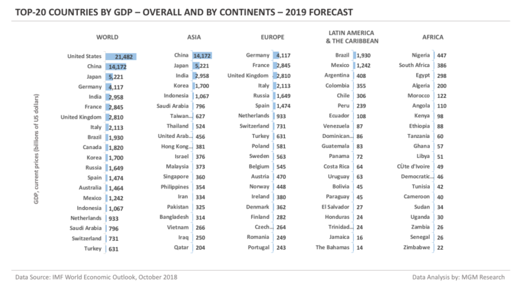 Top-20 Countries by GDP – Overall and By Continents – 2019 Forecast [OC]