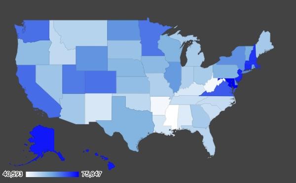 Data visualization : Total Household Income by State in the US in 2014 [OC]