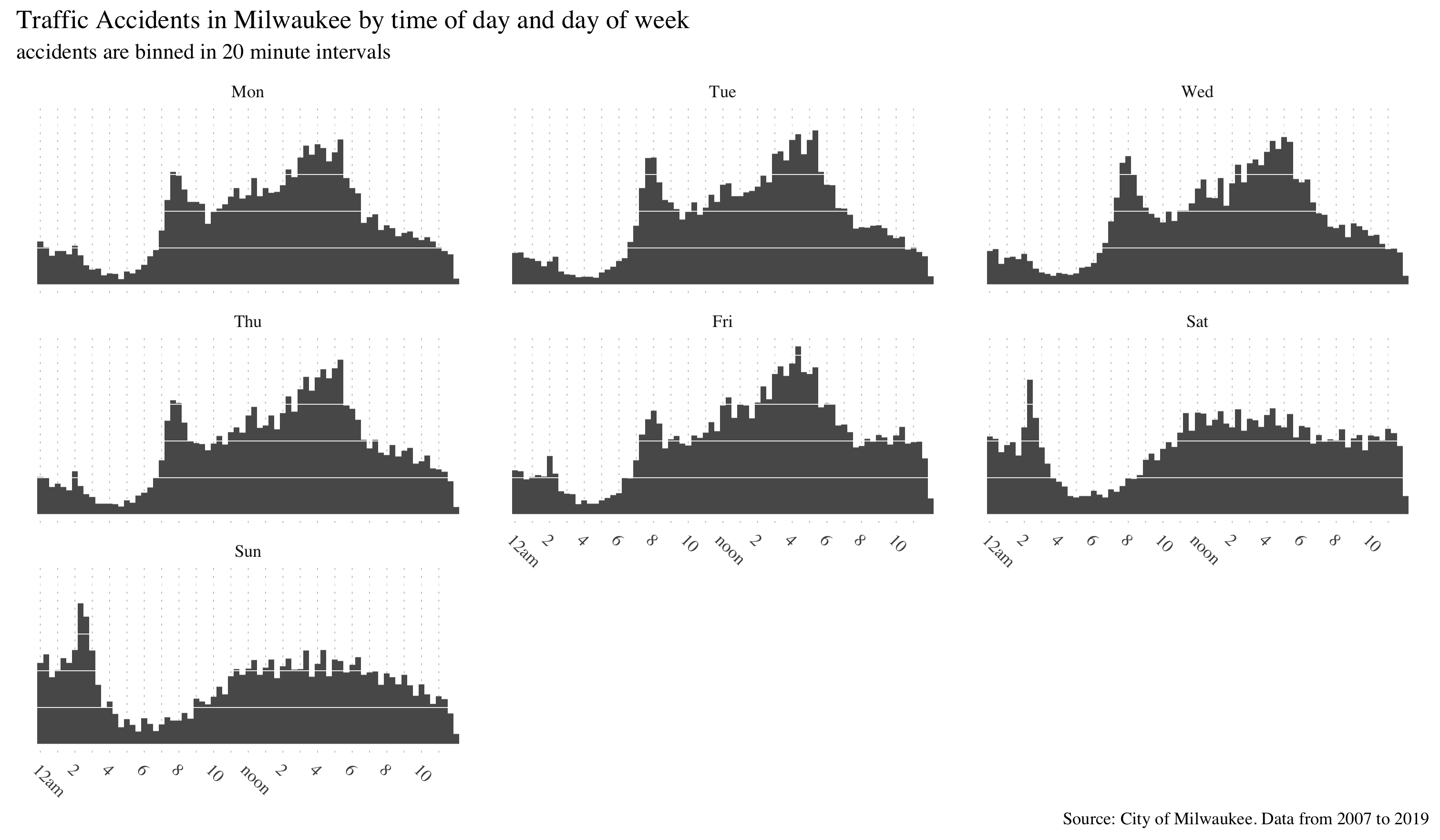 Data visualization : Traffic accidents in the City of Milwaukee by time of day for each day of the week [OC]