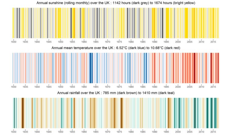 Data visualization : UK Sunshine, temperature and rainfall shown as coloured barcodes [OC]